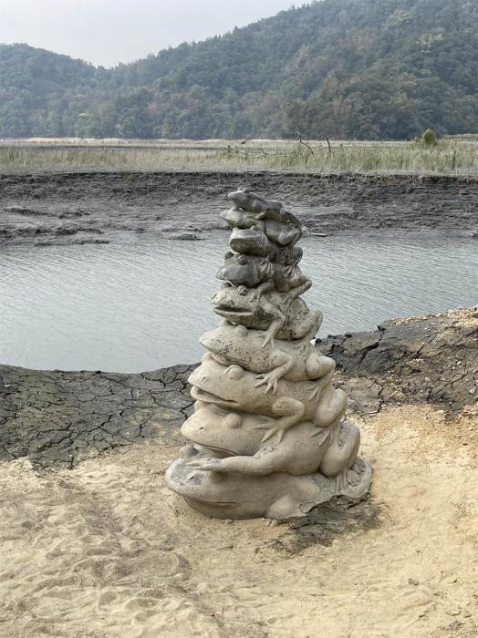 日月潭水位驟降,“九蛙疊像”全部上岸。圖片來源:臺灣中時(shí)新聞網(wǎng) 楊靜茹 攝