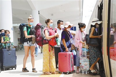 記者在瑯勃拉邦、萬象等地看到不少來自歐洲、亞洲的游客登上中老鐵路列車,前往老撾各地旅行。來自法國的尼諾帶著全家乘坐火車游覽了瑯勃拉邦、萬榮、萬象等地。他說:“乘坐火車在幾個城市之間穿行的時間差不多都在1小時,方便又快捷,讓我擁有更多時間深入當(dāng)?shù)?,感受風(fēng)土人情?!?/p>