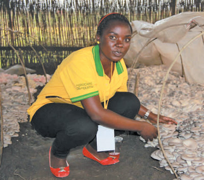 盧旺達國立大學(xué)的學(xué)生姍臺在菇棚中采收平菇。