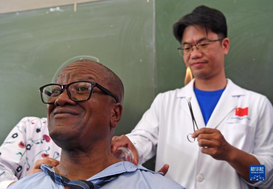 4月3日,在納米比亞溫得和克的伊曼紐爾·謝菲迪中學(xué)課堂上,校長(zhǎng)卡奇翁瓜體驗(yàn)拔火罐。新華社發(fā)(穆薩·卡薩克攝)