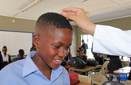 4月3日,在納米比亞溫得和克的伊曼紐爾·謝菲迪中學(xué)課堂上,一名學(xué)生體驗(yàn)針灸。新華社發(fā)(穆薩·卡薩克攝)