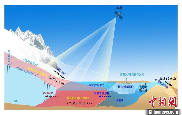 論文第一作者和共同通訊作者張國慶研究員介紹說,數字高程模型(DEM)廣泛用于估算全球冰川質量損失,但該方法只能觀測到冰川表面和水面,不能揭示發(fā)生在冰前湖泊水面以下的冰川質量損失。