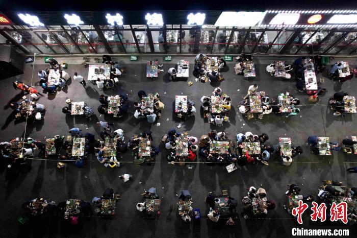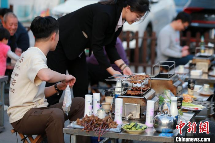 山東淄博,食客正在享用燒烤。 中新社記者 梁犇 攝