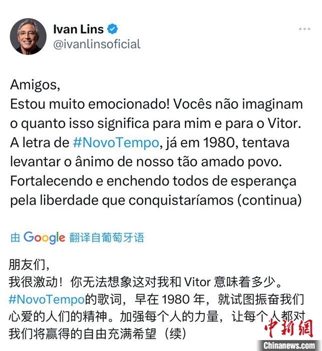 巴西名曲《Novo Tempo》在中巴元首會(huì)面時(shí)奏響,歌曲作曲、歌者伊萬(wàn)·林斯在社交媒體上留言。截圖