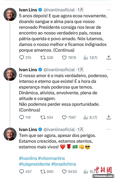 巴西音樂(lè)家伊萬(wàn)·林斯在社交媒體連發(fā)多條留言,引發(fā)網(wǎng)絡(luò)熱潮。截圖