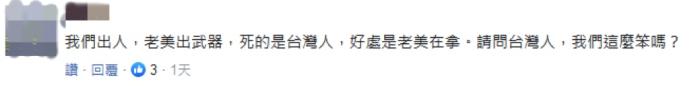 “我們出人,老美出武器,死的是臺(tái)灣人,好處是老美在拿。請(qǐng)問臺(tái)灣人,我們這么笨嗎?”