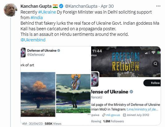 據(jù)俄新社報道,印度信息和廣播部高級顧問古普塔也對此表達(dá)了強(qiáng)烈的不滿,他在推特上轉(zhuǎn)發(fā)這一截圖,并寫道,“最近烏克蘭副外長曾在新德里請求印度支持。這張偽造圖背后隱藏著烏克蘭政府的真實面目。印度教女神卡莉被諷刺地畫在一張宣傳海報上。這是對全世界印度教徒感情的攻擊”。