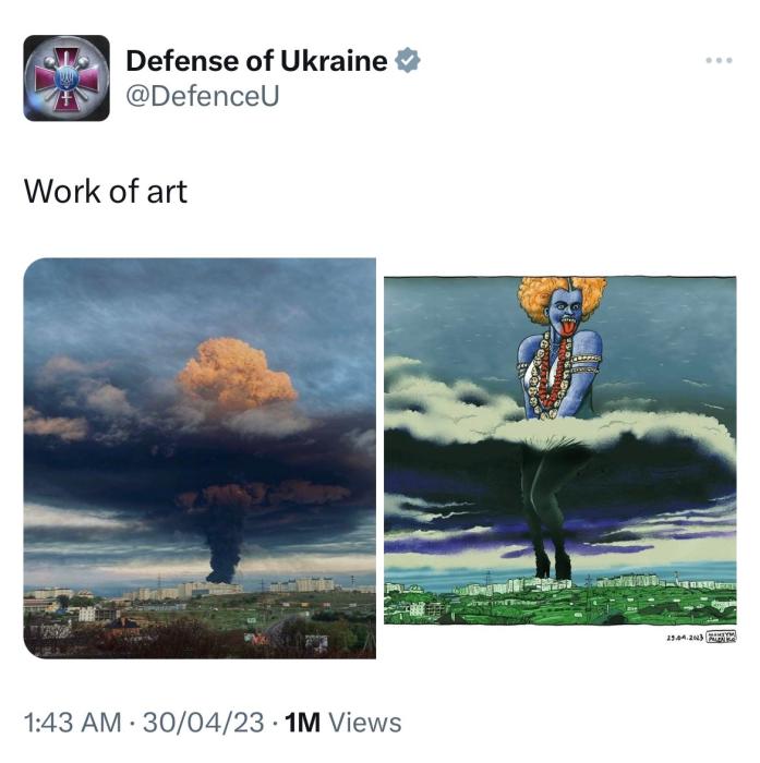 據(jù)俄新社、《印度斯坦時報》等多家媒體描述,烏國防部4月30日發(fā)布的這條推文中包含兩張圖片,第一張描繪了塞瓦斯托波爾灣一油庫遭無人機(jī)襲擊后升起的煙柱;另一張則是以第一張為基礎(chǔ)創(chuàng)作的漫畫,爆炸的濃煙中多了一名女性形象,她擺出與瑪麗蓮·夢露掩住裙擺相似的姿勢,而這一女性形象本身又與印度教女神卡莉相似。烏克蘭國防部對圖片的描述是“藝術(shù)作品(work of art)”。
