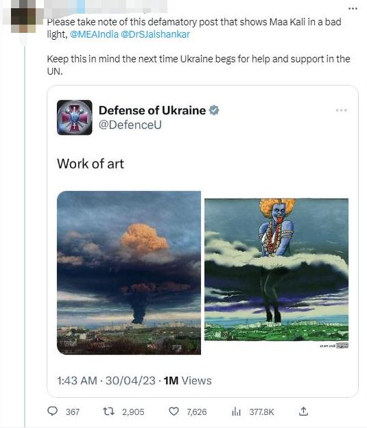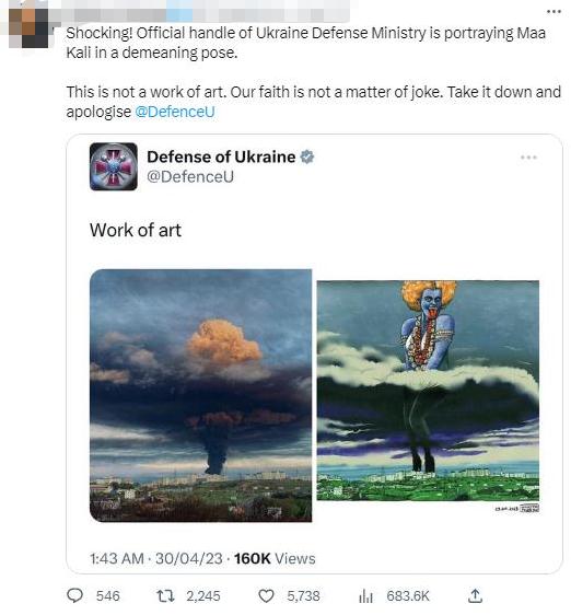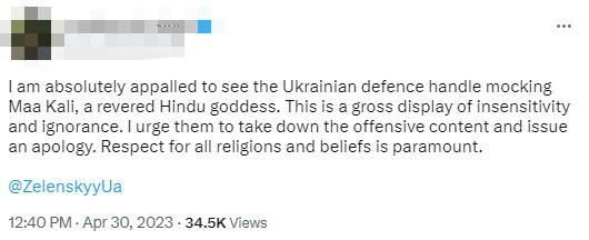 《印度斯坦時報》稱,這張圖被認(rèn)為丑化了印度教女神,是“對印度教的不尊重”,推文“遭到強(qiáng)烈反對”“傷害了印度人的感情”。甚至有印度網(wǎng)友呼吁印度官方干預(yù)此事。目前,烏克蘭國防部已經(jīng)刪除該推文。