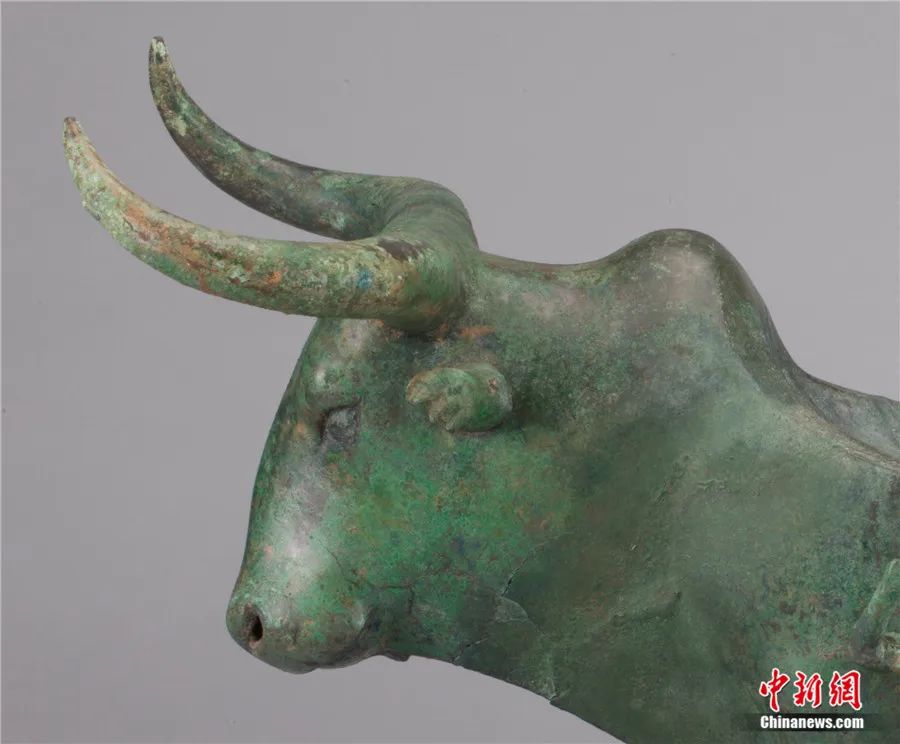 ?;~案的器物主體是一頭封牛,其特點(diǎn)在于兩邊牛角向內(nèi)彎曲,牛角尖向上翹起,牛脖子上有一個(gè)隆起部分,像駱駝的駝峰。封牛曾是亞洲的主要牛種之一,云南地區(qū)的封牛則通過有著“南方絲綢之路”之稱的蜀身毒道,從印度至緬甸,后進(jìn)入云南。這條交通要道促進(jìn)了滇國(guó)與其他文明在商貿(mào)、文化上的交流融合。