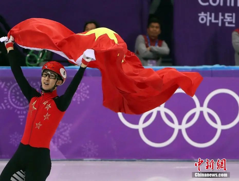 2018年2月22日,在平昌冬奧會短道速滑男子500米決賽中,中國選手武大靖奪得金牌。圖為武大靖手舉五星紅旗慶祝勝利。中新社記者 宋吉河 攝