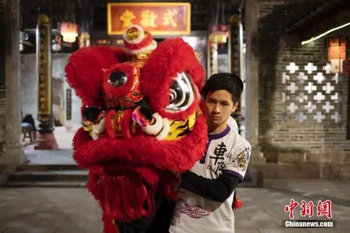 圖為2022年1月18日晚,廣州市天河區(qū)車陂龍獅體育會舞獅隊隊員王智銘在晴川蘇公祠拿著一頭紅獅。王智銘是一名“00后”,學習舞獅已3年,他說自己的目標是“世界獅王”。 中新社記者 陳楚紅 攝