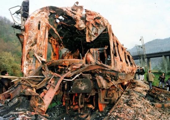 1999年3月24日,以美國(guó)為首的北約向南斯拉夫聯(lián)盟開始發(fā)動(dòng)大規(guī)??找u,武力干涉科索沃危機(jī)。資料照片顯示被北約飛機(jī)炸毀的火車。新華社發(fā)