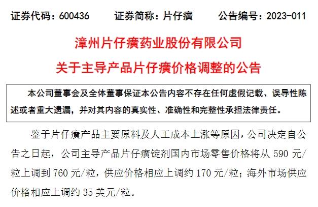 此番漲價(jià)的消息源于片仔癀5日發(fā)布的一則公告,其中提到,公司決定自公告之日起,主導(dǎo)產(chǎn)品片仔癀錠劑國內(nèi)市場零售價(jià)格將從590元/粒上調(diào)到760元/粒,供應(yīng)價(jià)格相應(yīng)上調(diào)約170元/粒;海外市場供應(yīng)價(jià)格相應(yīng)上調(diào)約35美元/粒。