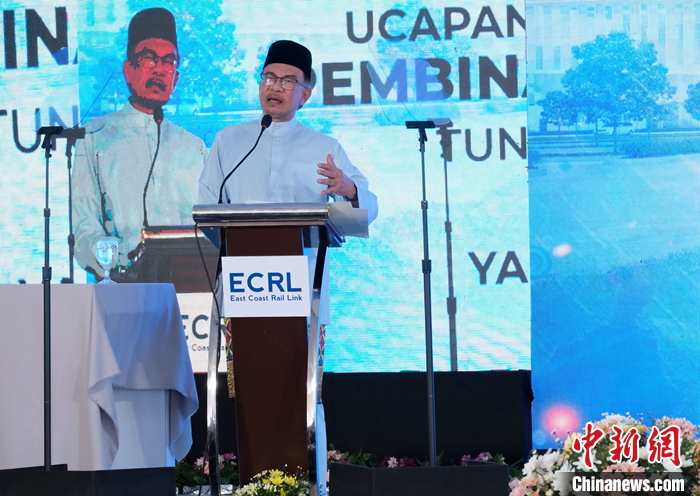 5月12日,馬來(lái)西亞?wèn)|海岸鐵路首個(gè)車(chē)站開(kāi)工儀式在吉蘭丹州哥打巴魯舉行。馬來(lái)西亞總理安瓦爾出席儀式并致辭。 中新社記者 陳悅 攝