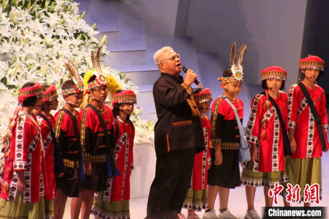 2009年9月,“88水災”追悼大會在高雄市巨蛋舉行,約5000人與會。圖為臺灣著名歌手胡德夫帶領九個孩子出場,演唱歌曲悼念逝者,為受災民眾祈福。董會峰 攝