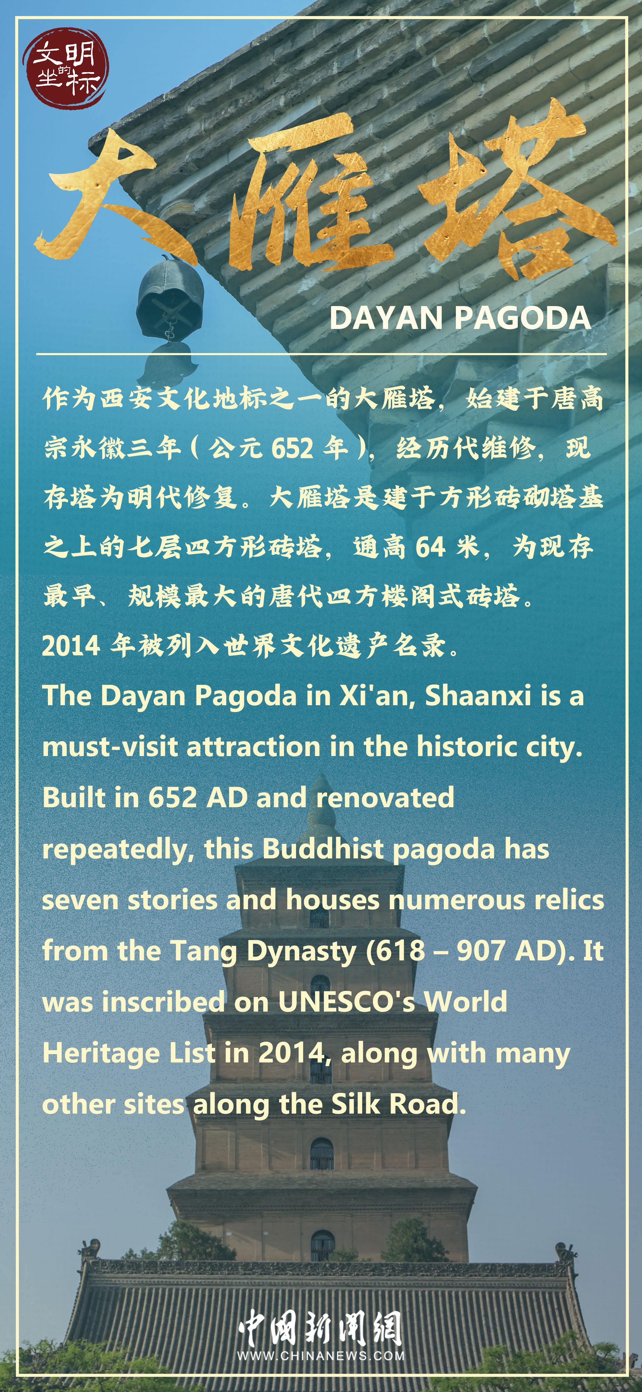 大雁塔又稱大慈恩寺塔,位于陜西省西安市雁塔區(qū),始建于唐高宗永徽三年(公元652年),為七層四方樓閣式磚塔。大雁塔現(xiàn)塔身通高64米,是為保存玄奘法師經(jīng)絲綢之路帶回長安的經(jīng)卷佛像而建,塔下碑文記述和佐證了大雁塔與絲綢之路佛教傳播的歷史。整個建筑氣魄宏大,莊嚴古樸,是唐代建筑藝術(shù)的杰作。走近大雁塔,感受“塔勢如涌出,孤高聳天宮”的氣勢,觸摸“曲江流飲,雁塔題名”的歷史文脈。