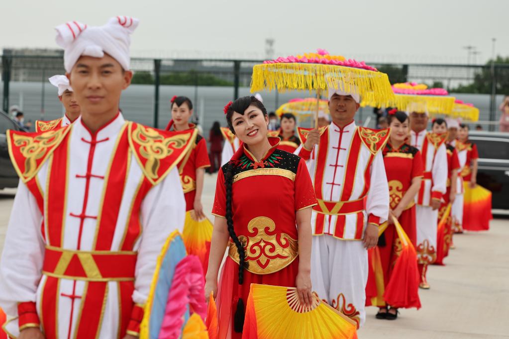 記者在西安咸陽國際機(jī)場看到,17日中午,由190人組成的表演團(tuán)隊已經(jīng)準(zhǔn)備就緒。當(dāng)?shù)孛癖妼⒁詿崆榈难?、歡快的秧歌等民間藝術(shù)表演,歡迎來自中亞國家的貴賓。