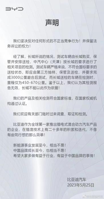 25日,長城汽車發(fā)布聲明稱,4月11日向生態(tài)環(huán)境部、國家市場監(jiān)督管理總局、工業(yè)和信息化部遞交舉報(bào)材料,舉報(bào)比亞迪秦PLUS DM-i、宋PLUS DM-i采用常壓油箱,涉嫌整車蒸發(fā)污染物排放不達(dá)標(biāo)的問題。