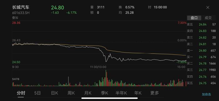 25日盤中,長城汽車一度跌超7%,比亞迪跌超2%。截至收盤,長城汽車股價(jià)報(bào)24.80元,下跌6.17%。比亞迪股價(jià)報(bào)255.60元,下跌2.41%。汽車整車板塊則下跌0.85%。有股民留言,“最慘的是同時(shí)擁有重倉長城汽車和比亞迪的股民,例如我,太慘了?!?/p>