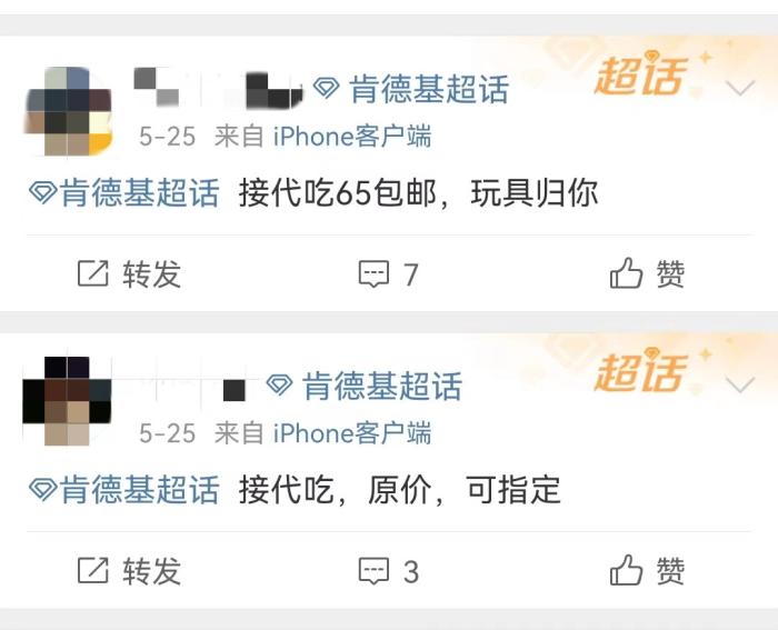 兒童節(jié)套餐全國發(fā)售下,不同地方的門店,售罄的速度不同,也為“代吃”業(yè)務提供了空間。一些異地網(wǎng)友承接“代吃”單子后,還可付費郵寄。