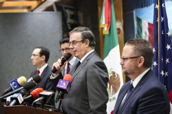 2019年8月5日,在美國得克薩斯州埃爾帕索的墨西哥駐埃爾帕索領(lǐng)事館,墨西哥外長埃布拉德(左三)在記者會上講話。新華社記者王迎攝