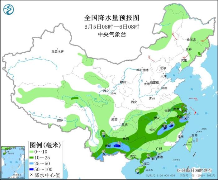 6月5日08時至6日08時,江淮東部、江漢南部、江南西部和中北部、西南地區(qū)南部、華南西部和南部等地部分地區(qū)有中到大雨,其中,江西中北部、廣西西部、云南東部等地局地有暴雨(50~80毫米)。內(nèi)蒙古中東部、東北地區(qū)、江南東北部等地部分地區(qū)有4~5級風(fēng)(見圖1)。東海北部海域?qū)⒂?~7級風(fēng)、陣風(fēng)8級。