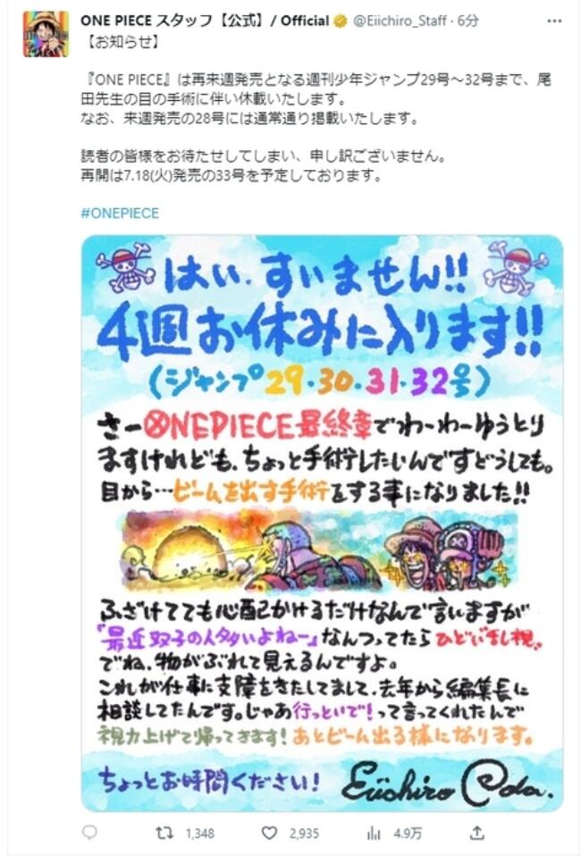 其官網(wǎng)還發(fā)布了尾田榮一郎在自己的手繪插畫(huà)上寫(xiě)的“請(qǐng)假條”。他表示:“非常抱歉,我將休息四周時(shí)間。《航海王》雖然已經(jīng)進(jìn)入終章,但由于眼睛的散光很?chē)?yán)重,看東西時(shí)出現(xiàn)重影,所以需要做個(gè)手術(shù)。請(qǐng)給我一些時(shí)間(修養(yǎng)一下)。”