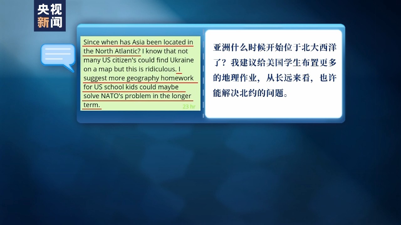 “亞洲什么時候開始位于北大西洋了?我建議給美國學(xué)生布置更多的地理作業(yè),從長遠(yuǎn)來看,也許能解決北約的問題?!?/p>