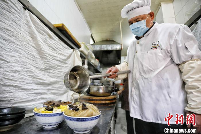 2023年2月,“四八席”廚師將熬好的老湯澆到每道菜上。 陳陽(yáng) 攝