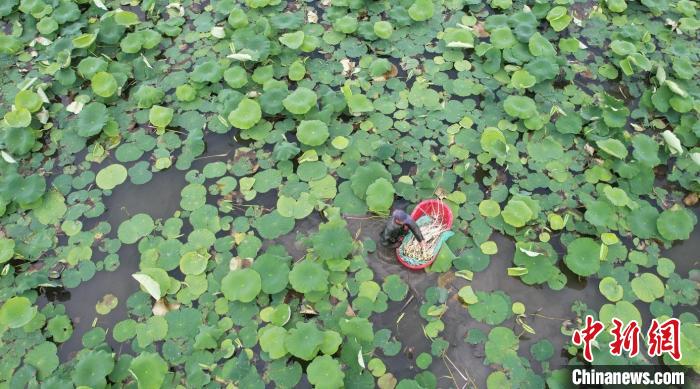5月23日,武漢蔡甸藕農(nóng)正在荷塘里“抽”藕帶?!≈行律缬浾?張暢 攝