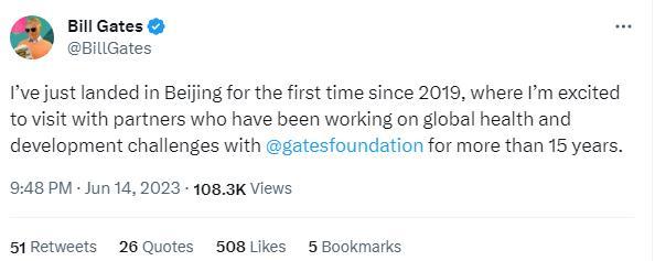 中新網(wǎng)6月14日電 北京時(shí)間14日,比爾及梅琳達(dá)·蓋茨基金會(huì)聯(lián)席主席兼理事、美國(guó)微軟公司聯(lián)合創(chuàng)始人比爾·蓋茨在社交媒體上發(fā)文稱(chēng)已抵達(dá)北京。