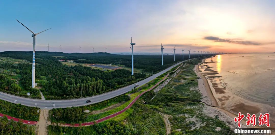 山東省榮成市北環(huán)海路,風(fēng)力發(fā)電機(jī)與沿海防護(hù)林形成一道靚麗的風(fēng)景線。近年來,中國大力推廣風(fēng)電產(chǎn)業(yè)等“綠色能源”,實(shí)現(xiàn)生態(tài)保護(hù)和可持續(xù)發(fā)展。楊志禮 攝