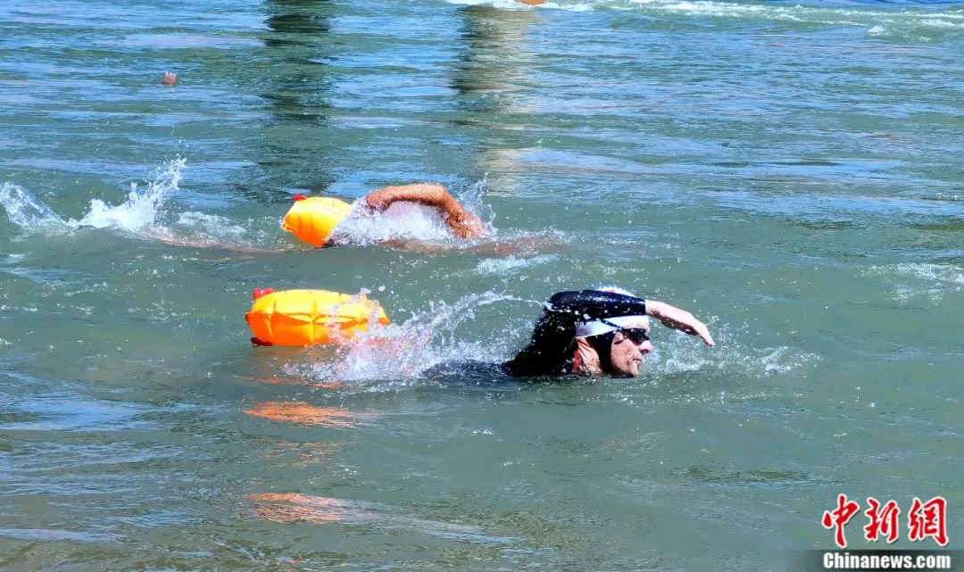 2022年7月,來自德國(guó)、美國(guó)、英國(guó)、比利時(shí)、俄羅斯等20個(gè)國(guó)家和地區(qū)的211名運(yùn)動(dòng)員和競(jìng)技愛好者,在青海省黃河上游水域參加搶渡黃河極限挑戰(zhàn)賽。李雋 攝
