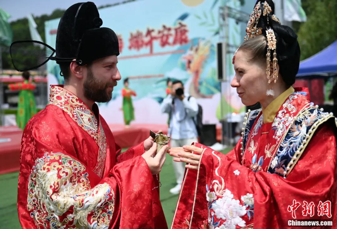 2013年6月16日,一對(duì)外國(guó)夫婦品嘗粽子。當(dāng)天,一場(chǎng)外國(guó)友人體驗(yàn)端午節(jié)習(xí)俗的活動(dòng)在吉林長(zhǎng)春舉行,近百名外國(guó)友人通過穿漢服、品嘗粽子、戴香包、投壺等“沉浸式”體驗(yàn)活動(dòng),感受中國(guó)傳統(tǒng)節(jié)日的魅力。張瑤 攝