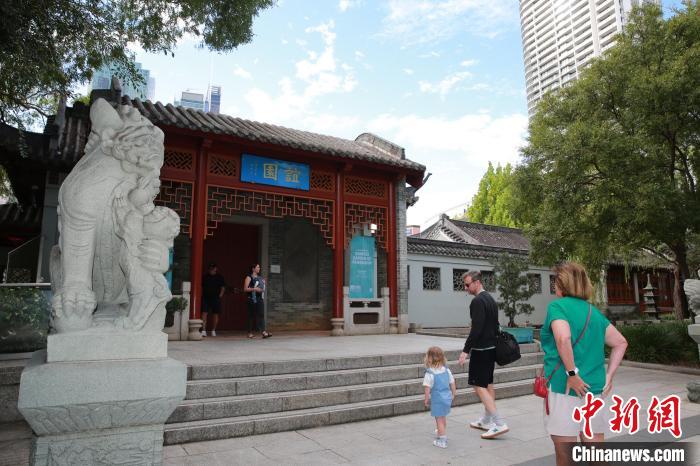 7月1日,游客在誼園“騰龍戲珠”琉璃壁前中餐廳休憩?!×_文俊 攝