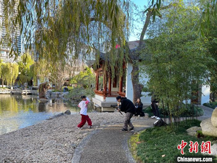 在湖邊,中國戲曲元素結合英文說唱的音樂吸引了游客們駐足。在悉尼從事汽修工作十余年的華人楊女士帶著兒子艾迪在湖邊拍攝音樂短視頻。穿著印有紅色京劇臉譜衛(wèi)衣的艾迪伴著動感音樂起舞。“我非常喜歡這里中西結合的感覺。希望在公共場合拍攝能培養(yǎng)孩子的自信心。”楊女士說。