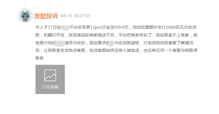 黑貓投訴平臺(tái)顯示,代收貨款相關(guān)投訴并不鮮見。有網(wǎng)友稱,在某電商平臺(tái)買蘋果手機(jī)支付訂金9.9元,到貨后額外支付1600元代收貨款,機(jī)器打開后,發(fā)現(xiàn)商品和商家描述不符,電商平臺(tái)把商家封了,快遞平臺(tái)讓聯(lián)系發(fā)貨地點(diǎn)客服,可根本聯(lián)系不上商家。
