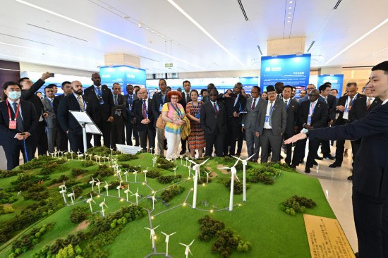 7月6日,駐華使節(jié)在國機(jī)集團(tuán)國際化經(jīng)營成果展廳內(nèi)參觀由該集團(tuán)承建的肯尼亞基佩托風(fēng)電項(xiàng)目沙盤。新華社記者 李鑫 攝