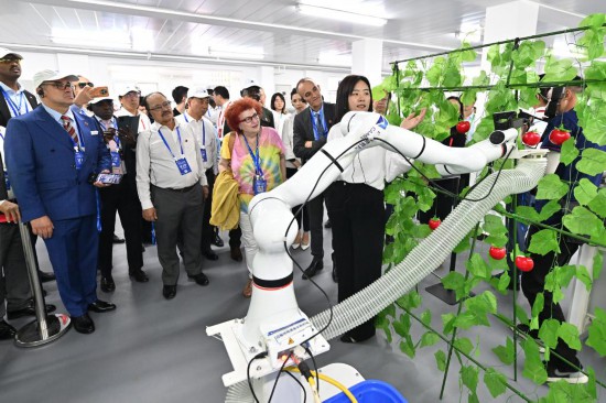 7月6日,駐華使節(jié)在國機(jī)集團(tuán)中國農(nóng)機(jī)院觀看番茄采摘機(jī)器人作業(yè)演示。新華社記者 李鑫 攝