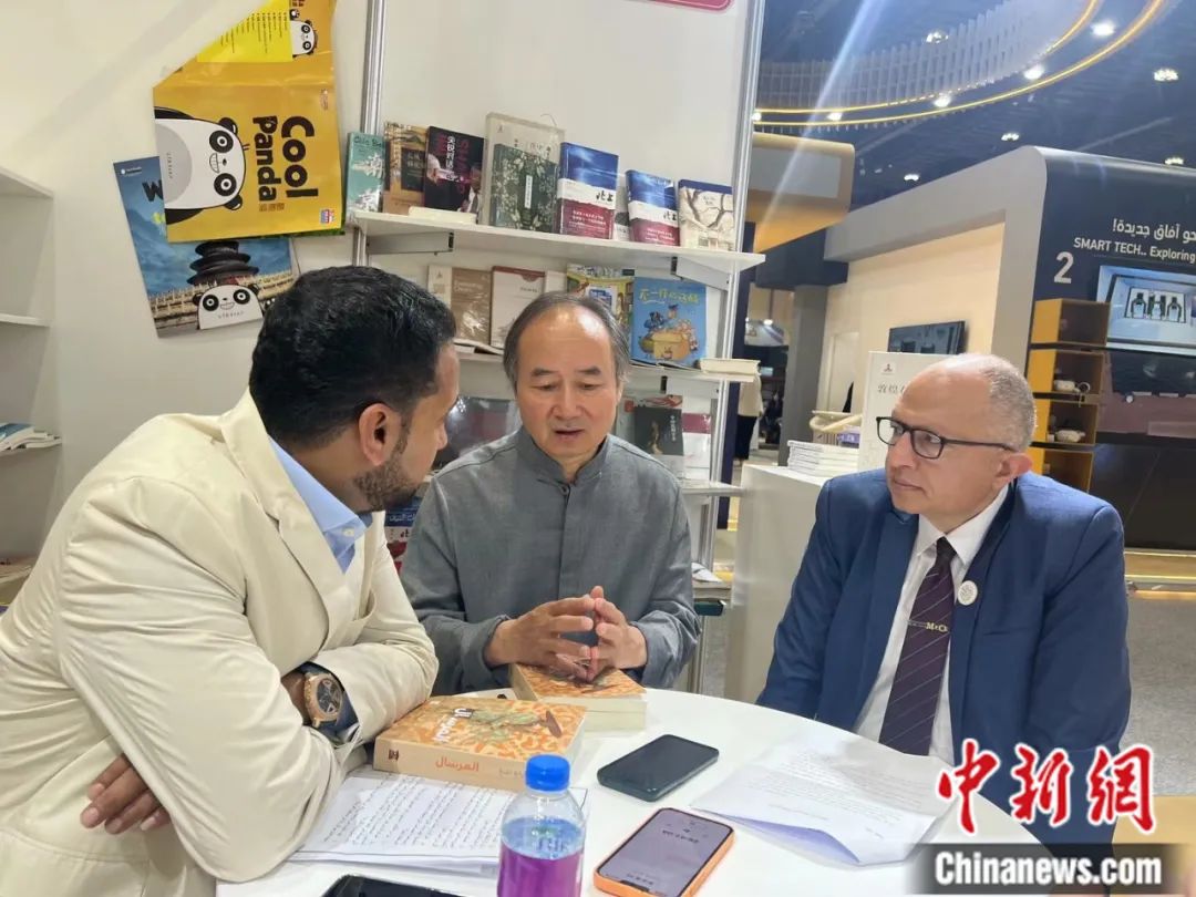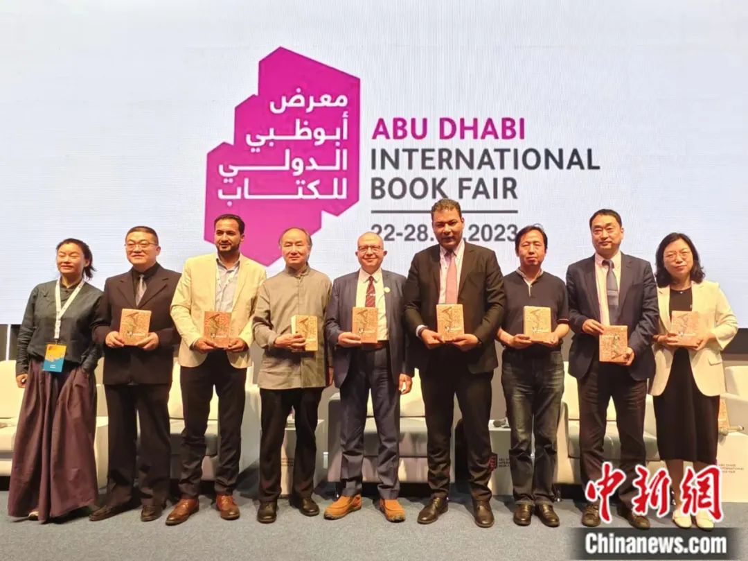在阿布扎比國際書展上,譯林出版社與埃及??诉~特文化集團(tuán)聯(lián)合舉辦《捎話》阿拉伯文版新書首發(fā)儀式。譯林出版社 供圖