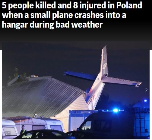 據(jù)報(bào)道,當(dāng)天,波蘭國(guó)家消防局發(fā)言人莫妮卡·諾瓦科斯卡·布林達(dá)(Monika Nowakowska-Brynda)表示,“波蘭中部的克辛諾(Chrcynno)地區(qū),受惡劣天氣影響,一架塞斯納型飛機(jī)在降落時(shí)墜入跳傘中心的機(jī)庫(kù),事發(fā)時(shí)有10人在機(jī)庫(kù)中,飛行員和在機(jī)庫(kù)中躲避暴風(fēng)雨天氣的4名人員遇難。”