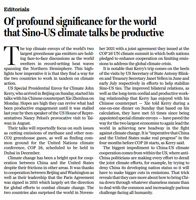 在舉世關注中,世界最大的兩個經(jīng)濟體的氣候特使舉行了面對面會談。當前,北半球正在經(jīng)歷創(chuàng)紀錄的熱浪,凸顯了中美在氣候問題上攜手合作多么重要。