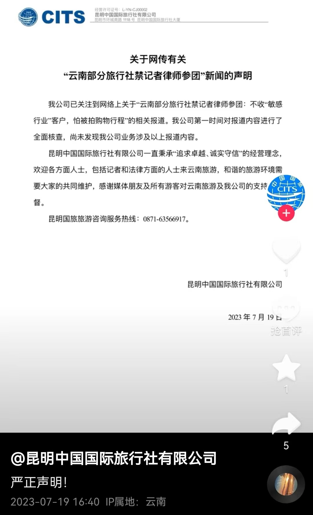 昆明中國國際旅行社在抖音上發(fā)布聲明。