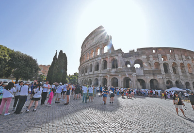 意大利首都羅馬7月18日最高氣溫超過41攝氏度,是今年以來當?shù)刈罡邭鉁?。圖為當天,游客聚集在羅馬斗獸場附近。