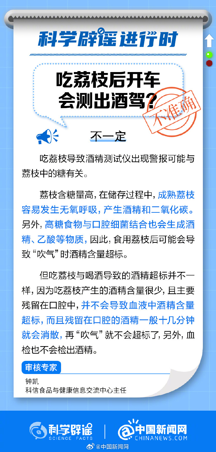 成熟荔枝容易發(fā)生無氧呼吸,產(chǎn)生酒精和二氧化碳。另外,高糖食物與口腔細菌結(jié)合也會生成酒精、乙酸等物質(zhì)。但吃荔枝產(chǎn)生的酒精含量很少,殘留在口腔的酒精一般十幾分鐘就會消散,血檢也不會檢出酒精。(來源:科學(xué)辟謠、中國新聞網(wǎng)微博)