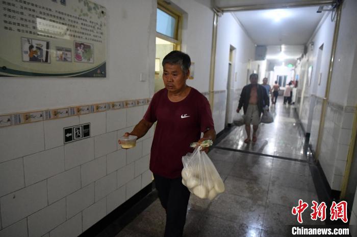 這是一間有八張床位的學(xué)生宿舍,屋頂?shù)碾娚纫恢贝抵?。?dāng)記者走進房間時,劉玉霞正吃著丈夫剛領(lǐng)回的盒飯。“一個是白菜粉條,一個是木須肉,還有湯,挺好?!痹诶先丝磥恚晏炖锍钥跓犸?,“家人平安已知足”。