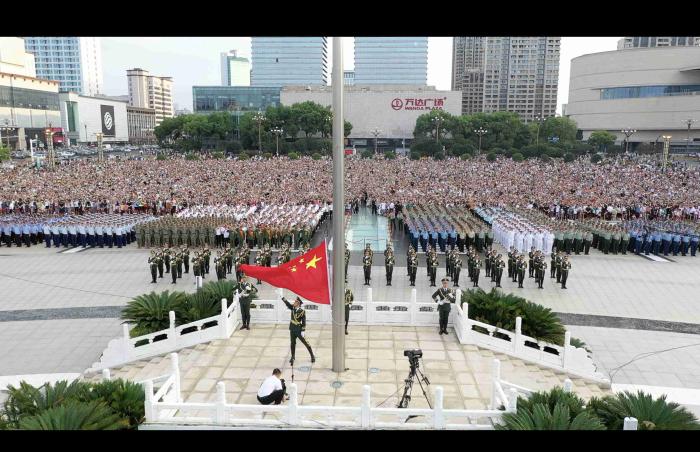 八月一號(hào)上午,全軍院校“強(qiáng)軍杯”系列比賽集中交流賽560余名官兵與南昌市相關(guān)代表集合在南昌八一廣場(chǎng)參加升旗儀式。 劉宇龍 攝