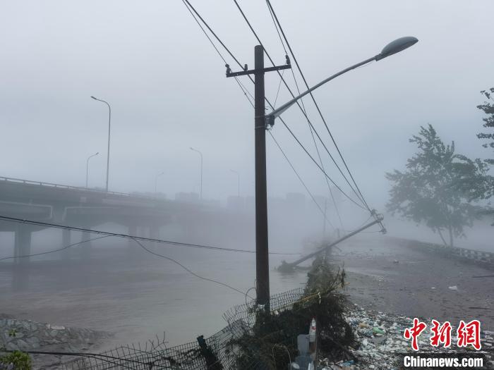 8月1日下午,在永定河京原漫水橋現(xiàn)場,武警北京總隊(duì)機(jī)動第三支隊(duì)200名官兵正在此處實(shí)施封堵作業(yè),以防止洪水漫溢,影響周邊百姓。圖為京原漫水橋上的一根電線桿已被洪流沖歪,各種雜物散落各處。中新社記者 劉亮 攝