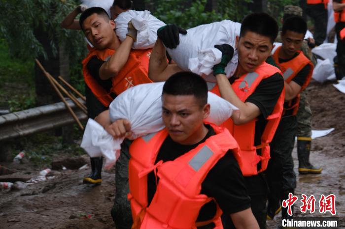 7月31日,永定河京原漫水橋附近發(fā)生漫溢,洶涌的洪水越過堤壩、漫上河岸。為保障沿岸居民安全,北京市門頭溝區(qū)水務(wù)局與區(qū)武裝部、區(qū)防汛抗旱指揮部實(shí)行統(tǒng)一協(xié)調(diào)調(diào)度,由武警北京總隊(duì)機(jī)動第三支隊(duì)200名官兵對該處實(shí)施封堵作業(yè)。